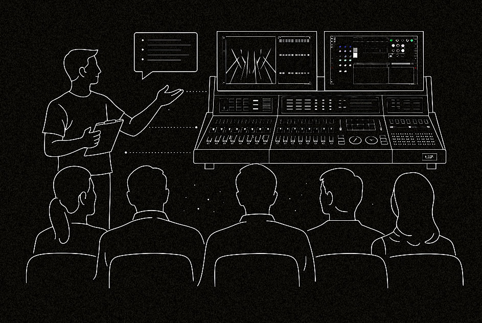 una spiegazione tecnica su come è strutturato il banco luci e la console MA, rivolta ai partecipanti.
