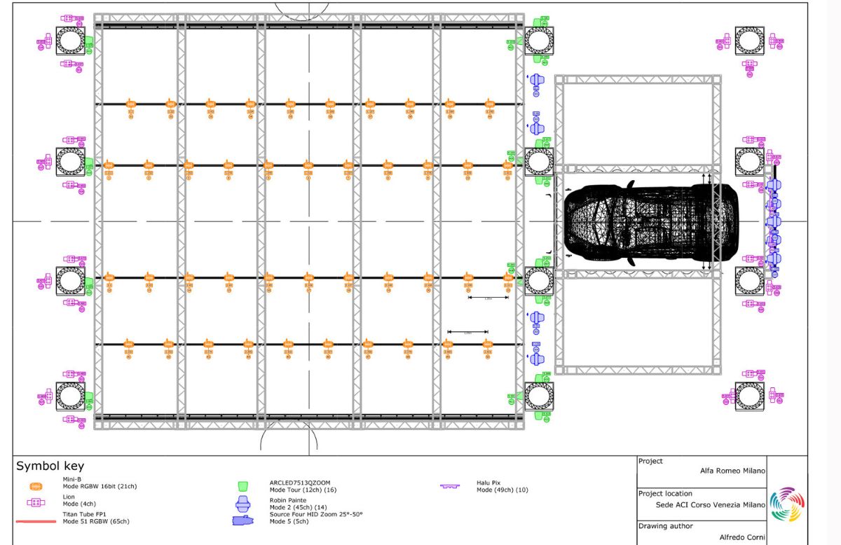 Per il design dell’illuminazione, Corni ha scelto i Robe Painte, apparecchi potenti, piccoli, leggeri e versatili con fonte luminosa a LED. Dieci di questi sono stati posizionati dietro l’auto su un pod verticale, mentre altri sono stati disposti in sala per segnare il tempo della traccia musicale. Questa scelta si è rivelata essenziale, considerando le limitazioni dell’altezza massima disponibile di 4,5 metri in un edificio antico e il carico di oltre 20 tonnellate di materiali su un’area di 200 mq, inclusi il peso dell’auto e dei numerosi ospiti.